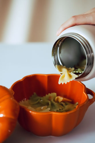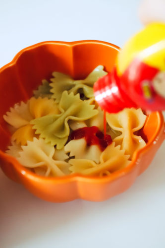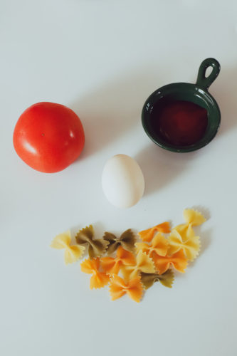 将蝴蝶意面放入焖烧杯,再次倒入沸水,盒盖后焖煮10min, 之后将水滤出; 将之前备好的番茄块和蛋液倒入焖烧杯内,再挤入适量的番茄酱,重新倒入开水至八分满,略微搅拌后合盖焖煮30min。