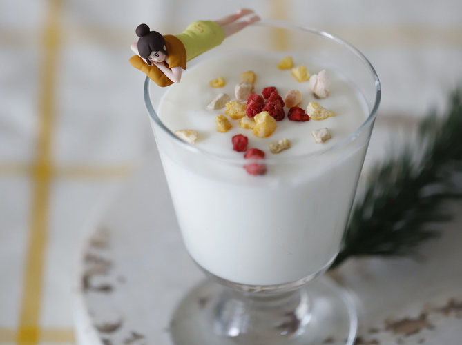 在焖烧杯内倒入酸奶粉,加入350ml/45℃的温水搅拌均匀。