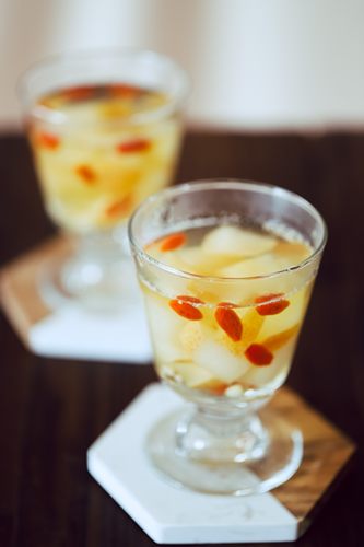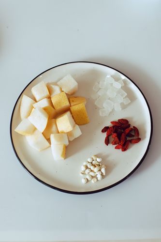 处理食材:枸杞用清水浸泡5分钟,雪梨去皮去核切成块状,川贝碾成粉末状;将川贝和冰糖放入小锅中,加入400ml清水,开火煮至冰糖融化。