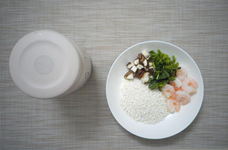 大米洗干净前一晚泡着,糯米会有粘稠的感觉;鲜虾去壳挑丝,蔬菜切段,香菇切丁。