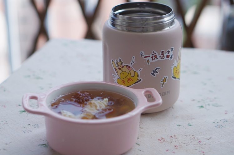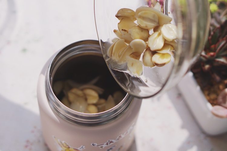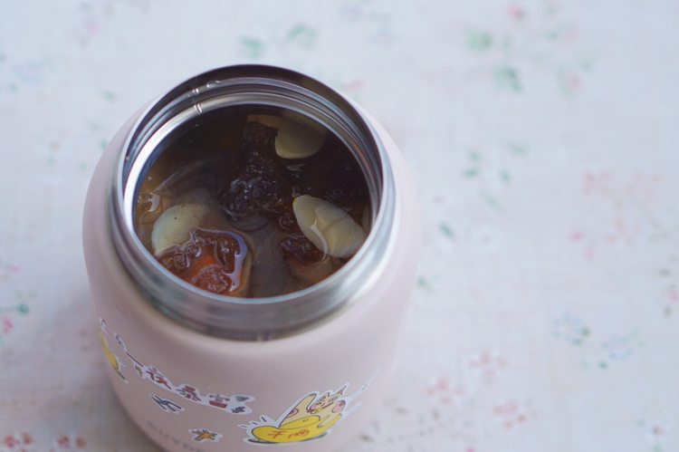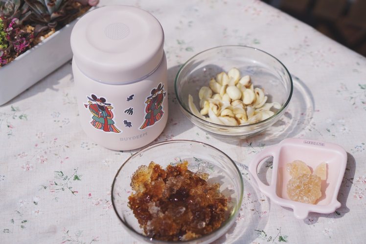 预热焖烧杯一分钟,然后将百合、莲子、桃胶放入杯中,倒入8成满沸水。