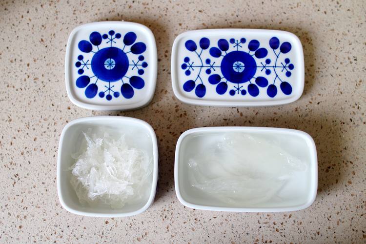 2. 关于挑杂毛:北鼎的燕盏品质高比较干净,基本上冲冲就行了,没什么杂毛。其他的燕盏要在泡发2小时时换一次水,用小镊子挑去明显的毛,可以把燕窝放进滤网里用流动水冲一冲。