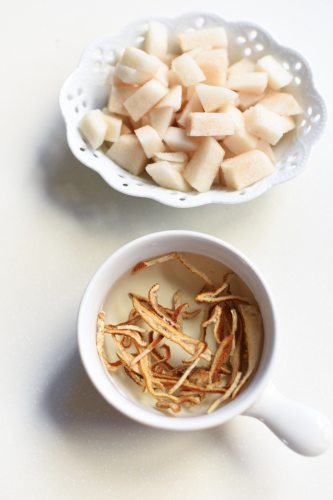 陈皮提前浸泡30分钟。将雪梨清洗干净,去芯,切块。