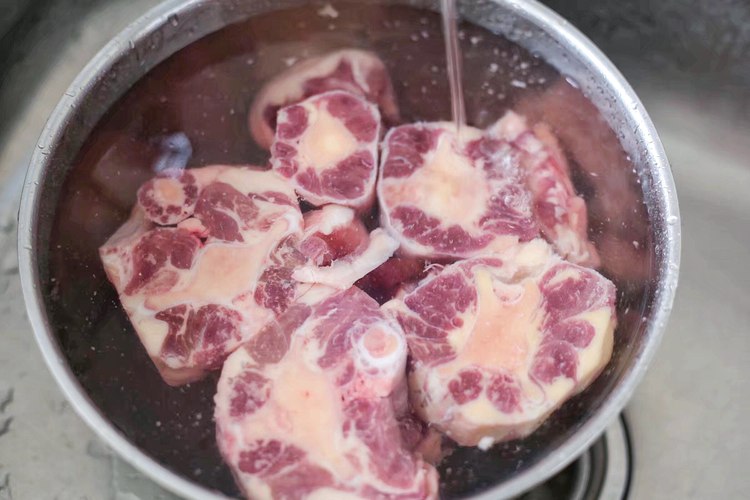 冷水浸泡牛尾4——6小时去除血水,期间注意换水。ps:如买的是冷冻牛尾请先在冰箱冷藏放置8-13小时解冻~