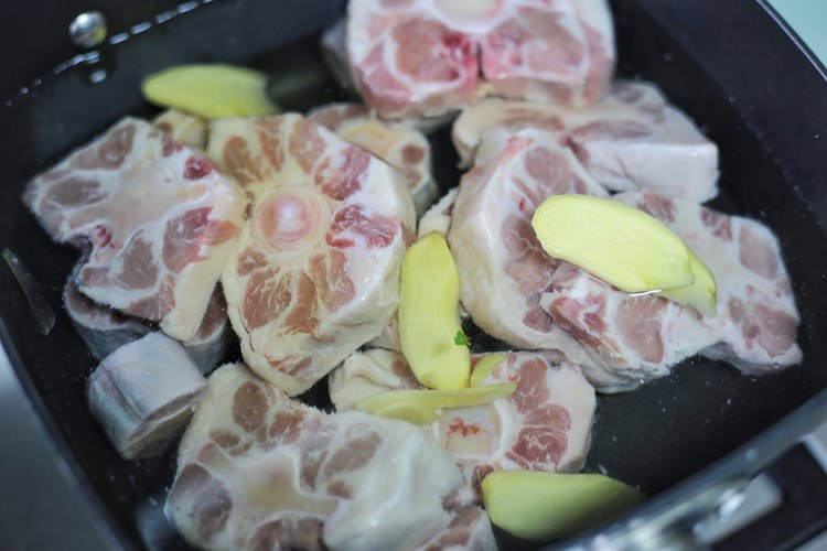 洗净牛尾后,冷水入锅淹没牛尾、加入姜片和料酒,煮开。(期间用勺子去除血沫)