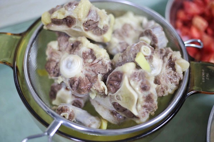 煮牛尾的汤,去除血沫和沉淀,沥干净作为一会儿烧牛尾用的高汤。