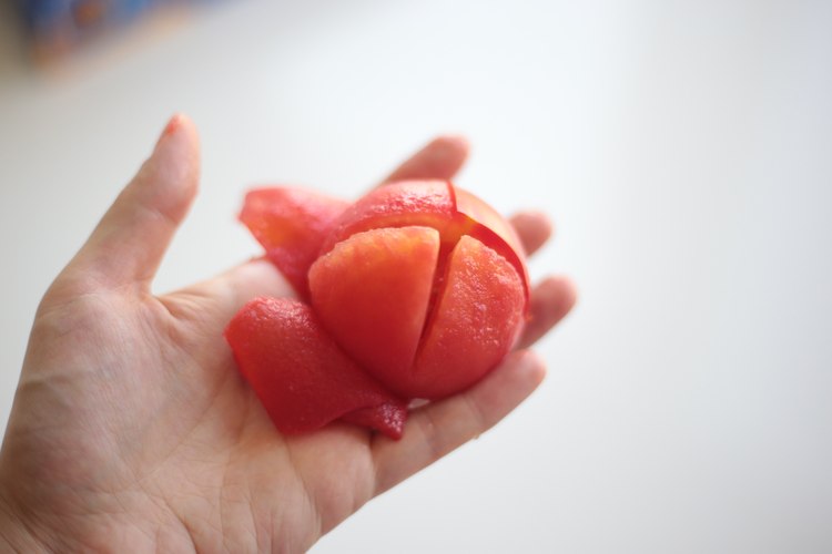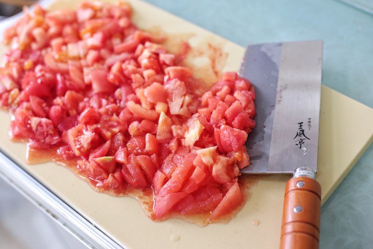 西红柿去蒂底端用刀划十字,放入盆中加入热水,捞起去皮。