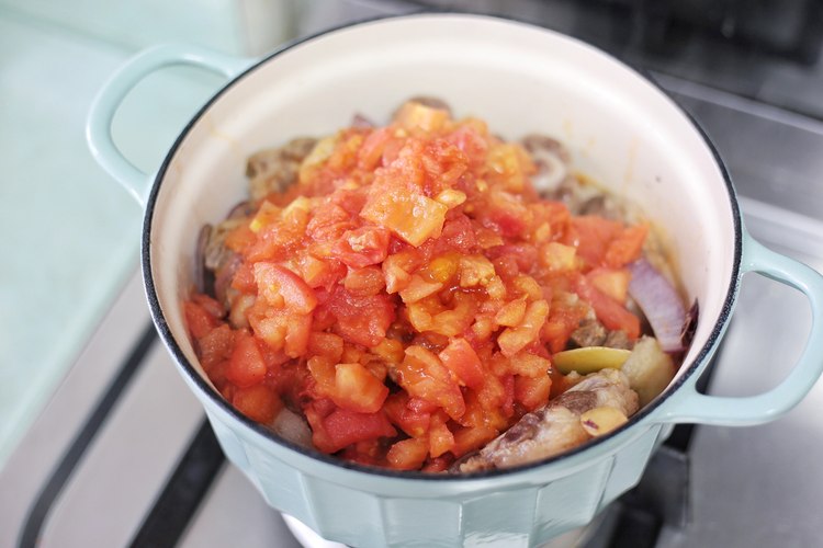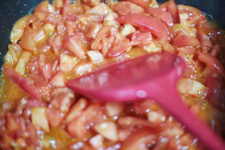 在炒牛尾的同时可以另起一锅,热锅入油将西红柿放入开始翻炒。