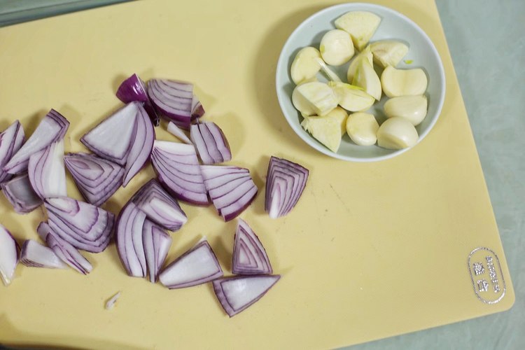 洋葱切好、大蒜切好~(大小根据自己喜好切、不建议太小,炖烧过程中容易太碎)。