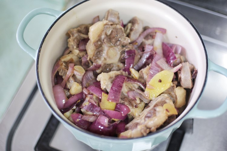 提前开中小火预热珐琅锅、锅热后倒入油、放入花椒八角洋葱大蒜炒出香味,随后加入牛尾翻炒均匀,炒到牛尾呈微黄色。