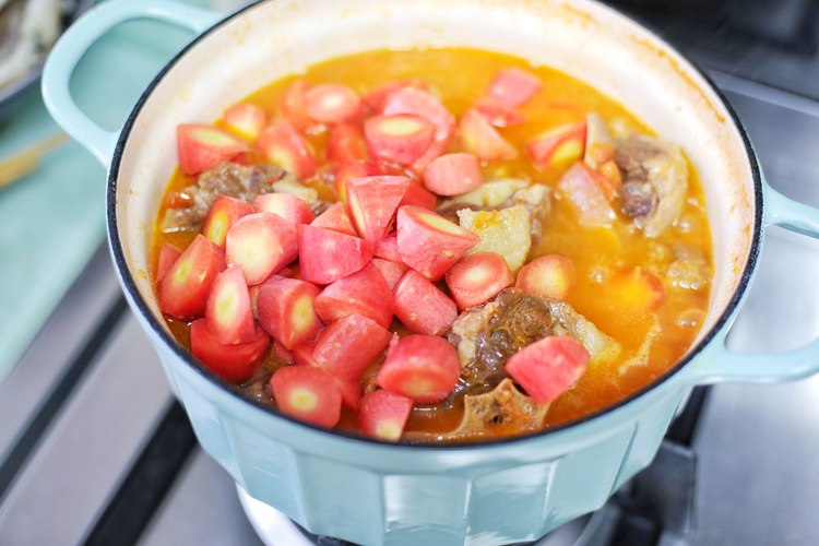 用筷子试试,待牛尾软了之后将切好的胡萝卜加入,继续加盖焖煮15-20分钟。