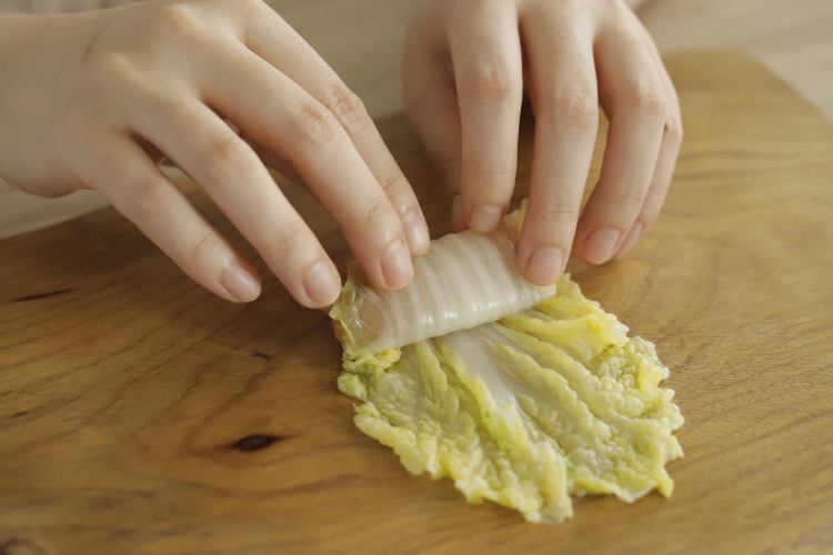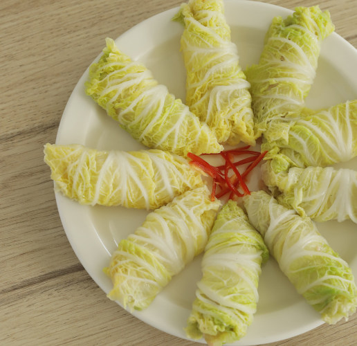1. 娃娃菜也可以用大白菜代替,请注意只保留菜叶,切成大小合适的长条即可。