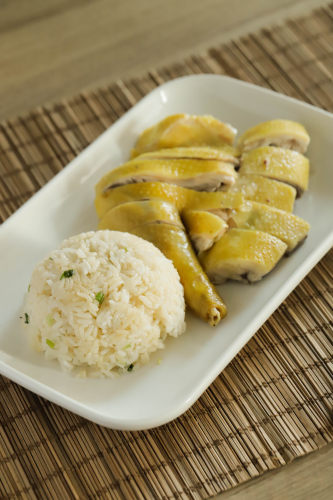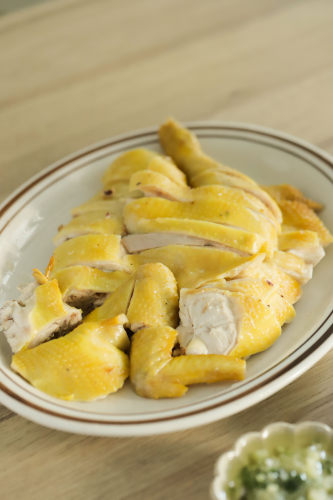 白盘中接住的鸡汤可用于蒸油饭, 配合去骨的整鸡即可搭配出美味的海南鸡饭!