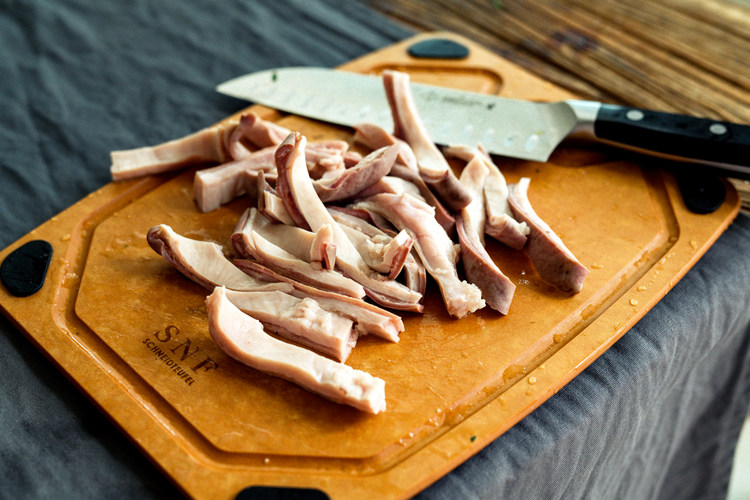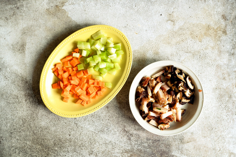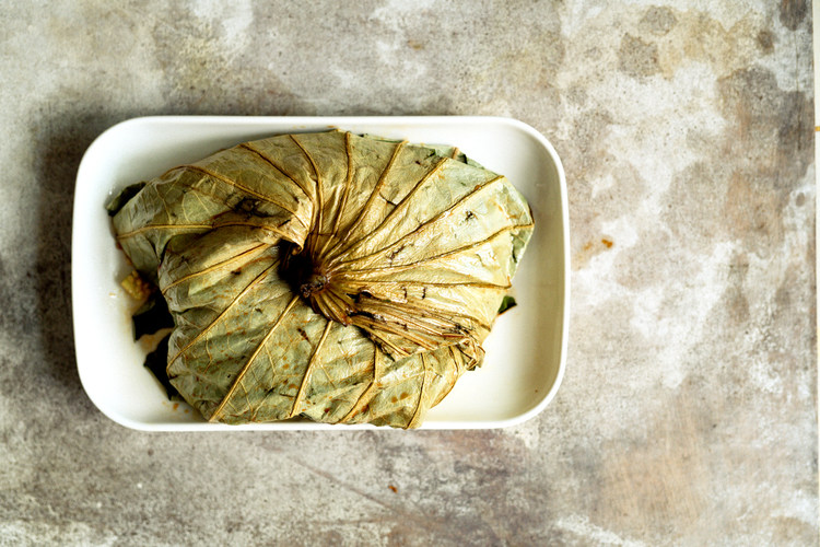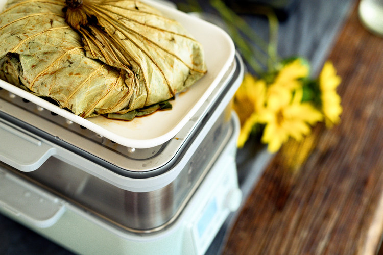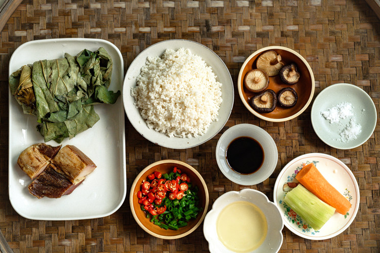 1. 腊肉、香菇干、干荷叶、糯米需提前一夜泡发,用新鲜荷叶直接蒸更好哦。