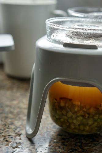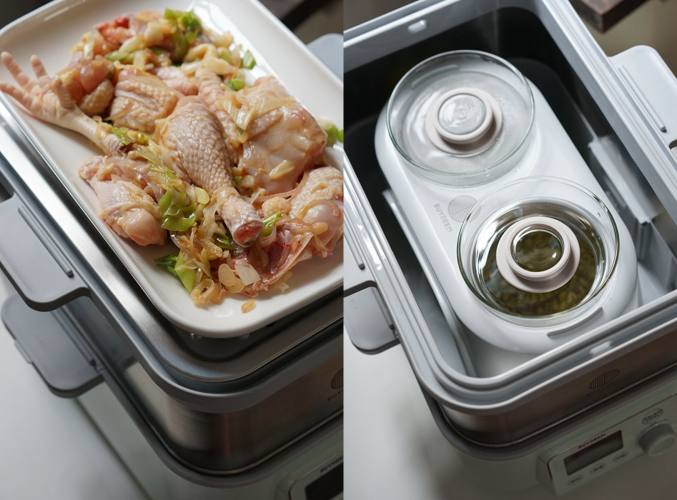 一锅出盐焗鸡和甜汤,如果是自己吃,还可以把其中一盅绿豆汤换成米饭哦~只要花上半小时的时间,就能吃上一顿超丰富的晚餐了!