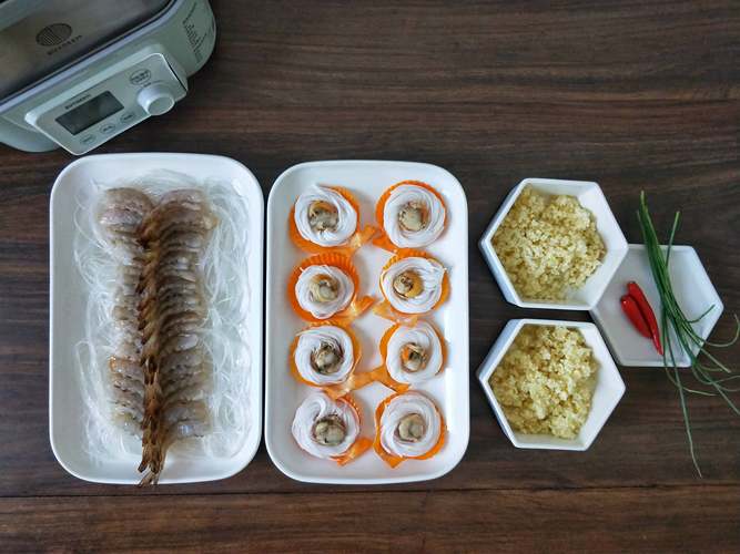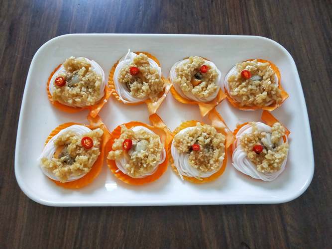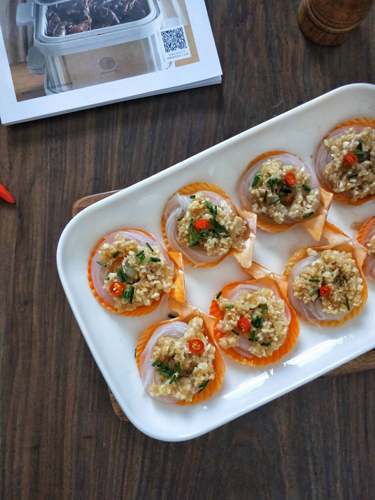 用小勺子给每一个扇贝上浇上香喷喷已经调好味的蒜蓉油,根据个人喜好,我加了1粒小米辣。