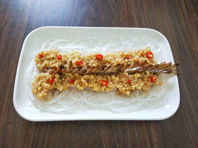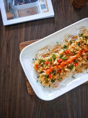虾清洗干净,去掉虾头剪去虾脚,用刀从中间片开去掉虾线,只留尾部连着,接着给虾身断筋以免蒸好的虾翘起;粉丝用温水泡软,其中一把粉丝铺盘子上,将虾背朝下虾肉朝上,尾也朝上,虾身分两边码放在粉丝上面。