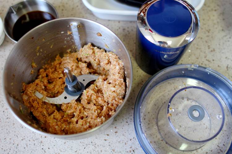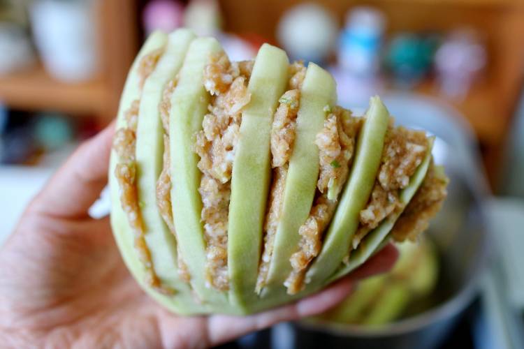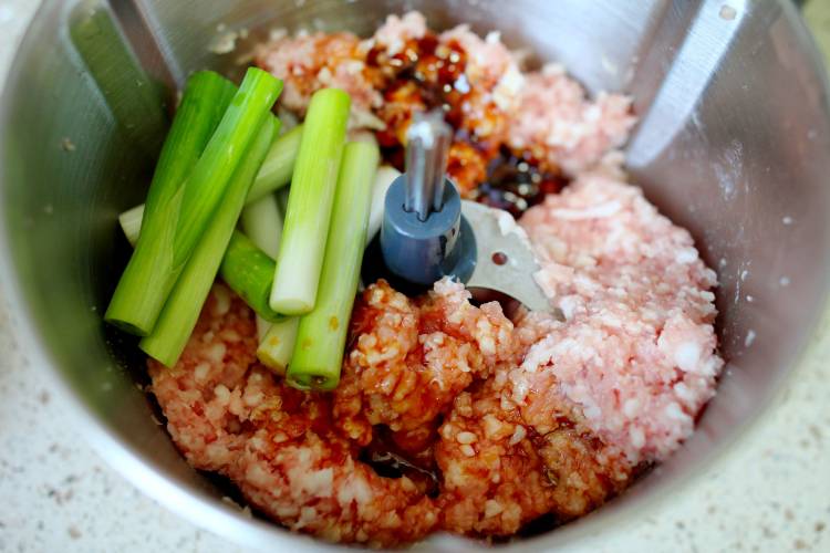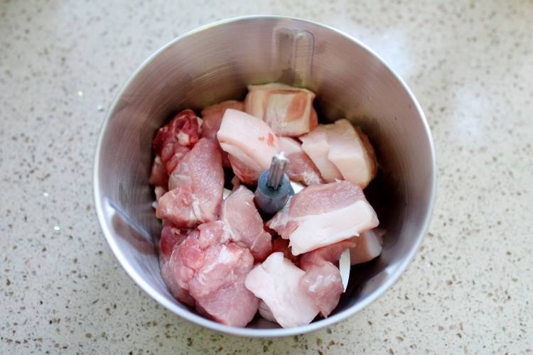 2. 制作肉馅那一步,如果是现成的肉馅,要用筷子多搅拌一会儿,让肉馅绞上劲儿。也可以慢慢打入一些水,我没打,因为蒸茄子时也有汤汁浸泡,肉馅口感也会比较嫩。