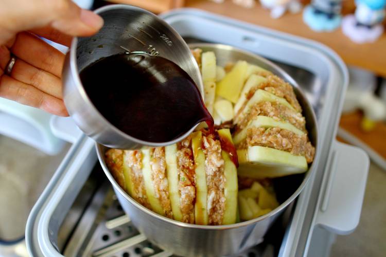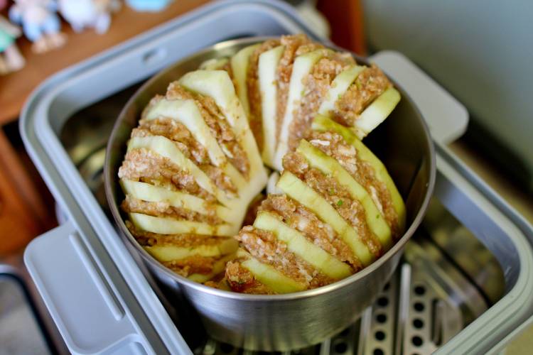 3. 一定要用深容器制作,这样茄子在能泡在汤汁里,#北鼎蒸炖锅# 的增高配件救我,深容器毫无压力。