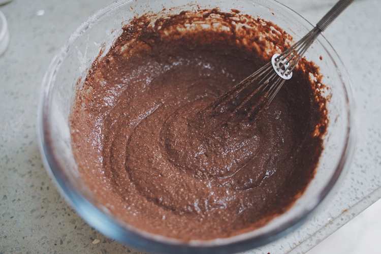 筛入全麦粉,可可粉,泡打粉,搅拌均匀,再加入代糖和玉米油,搅拌到无颗粒状。