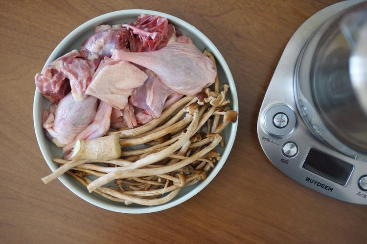 鸭子带骨切块洗净,如果用干茶树菇先提前半小时将茶树菇泡发,用鲜茶树菇就可以直接洗净去根使用了,姜切丝、切片各一半。