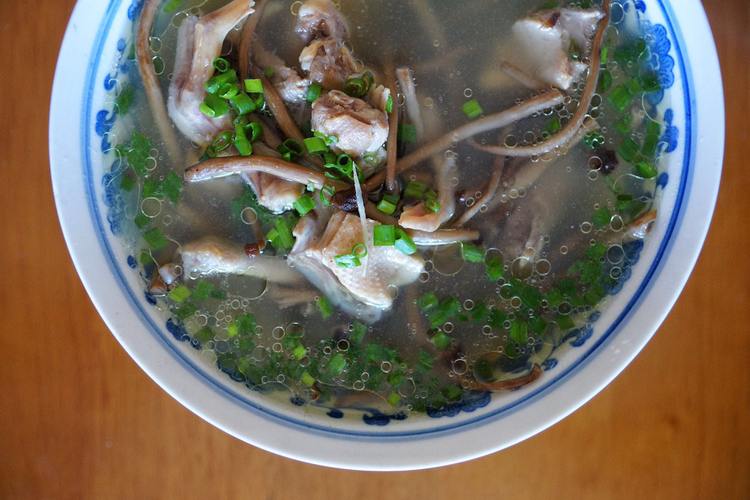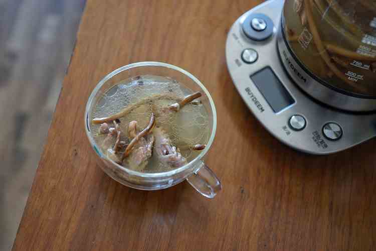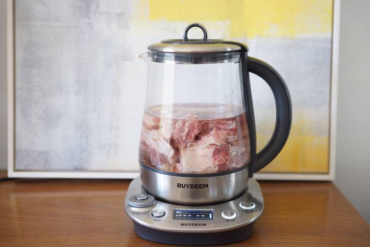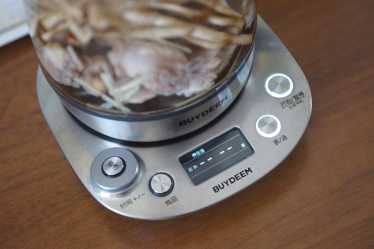 鸭子和姜丝、茶树菇放入养生壶,加水至1200ml,选择养生汤功能,炖煮1小时。