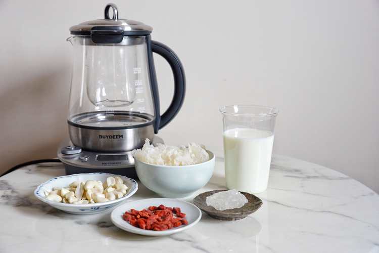 牛奶放入炖盅,加入花生米、枸杞、银耳、一小块黄冰糖,选择燕窝炖模式。