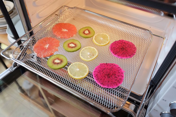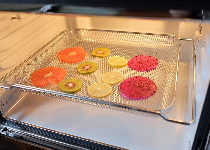 尽量把水果切薄片,这样容易加快风干的时间,然后把水果片铺在空气炸网上。