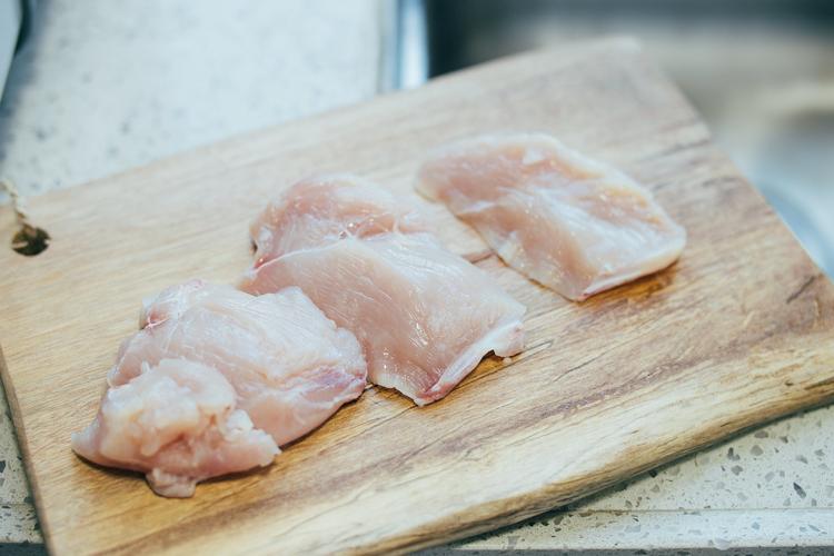 将鸡胸肉洗净擦干水分,斜切薄片。