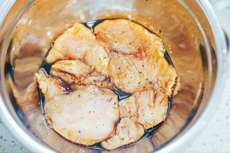 将生抽、料酒、黑胡椒倒入鸡胸肉中搅拌均匀,腌制半小时或一夜。