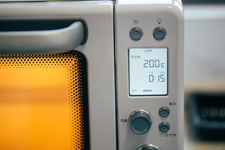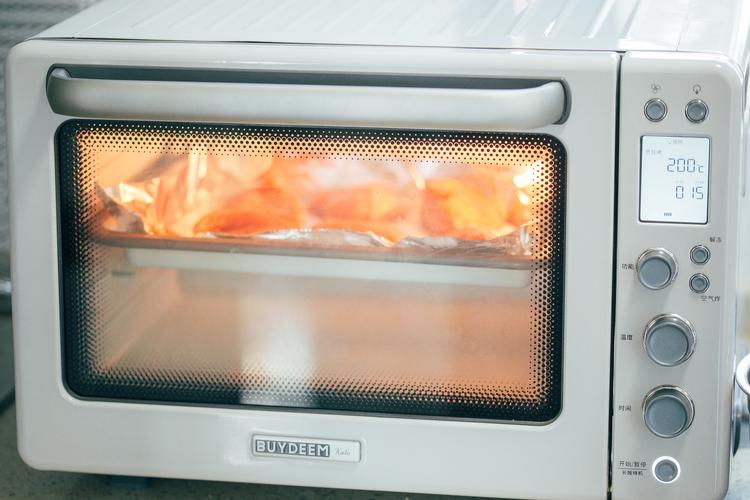 烤箱预热好后将烤盘放入烤箱中层,按“开始”键。