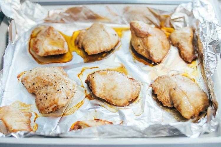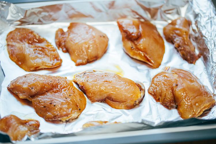 烤盘上铺上锡纸,将腌制好的鸡胸肉平铺在烤盘上。