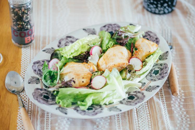 将鸡胸肉和沙拉蔬菜混合,倒入沙拉酱汁,减肥人士可撒一些黑胡椒盐即可享用。