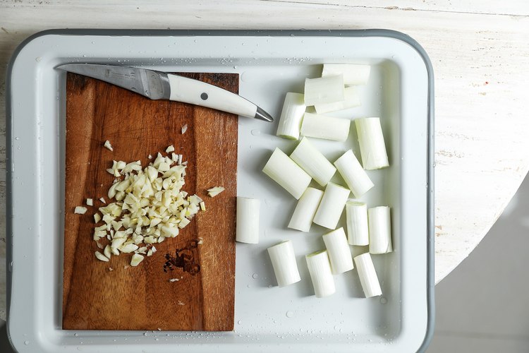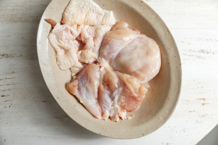 鸡肉和大葱装盘,依次倒入老抽、生抽、料酒、食用油和蒜蓉,腌制半个小时以上。