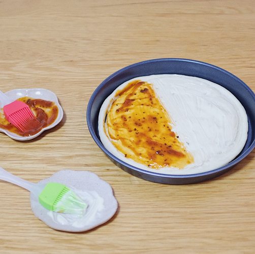 烤箱选择‘披萨烤’功能,200度、20分钟预热,将饼胚放入披萨烤盘,1/2抹披萨酱,1/2抹沙拉酱。