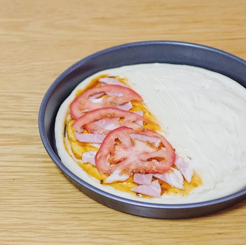 披萨酱上面从底往上依次摆上培根碎、彩椒圈、番茄片、腊肠。