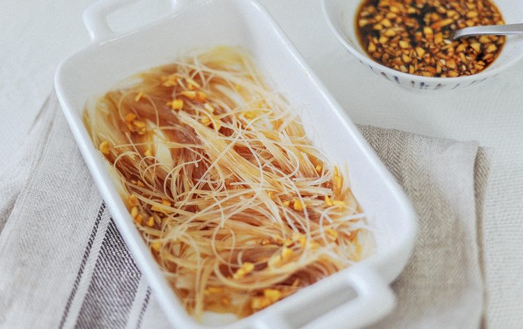 调酱汁:大蒜切成碎末,蒸鱼豉油3勺,生抽1勺,食用油3勺,香油1勺,白胡椒粉适量,白糖半勺,清水3勺,可根据个人口味做些调整。烤碗底部铺上粉丝,舀入两勺酱汁拌匀。