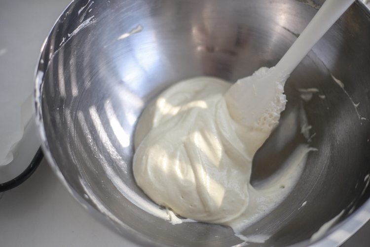 把过筛后的粉类加入蛋白霜中,用刮刀搅拌均匀。