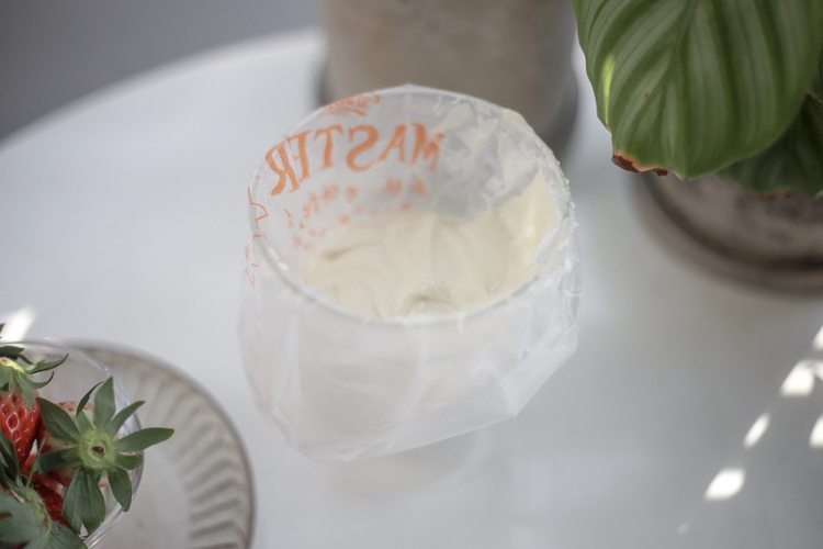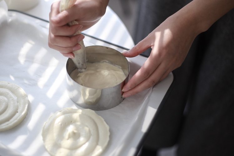 挤在15cm直径的慕斯圈中,可以挤出三份。