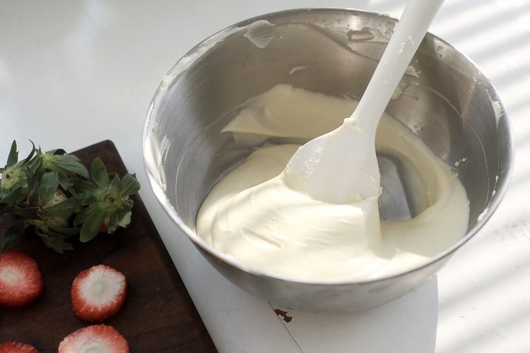 混合室温软化的奶酪和淡奶油,加入砂糖搅打均匀,将奶油奶酪混合奶油打发。