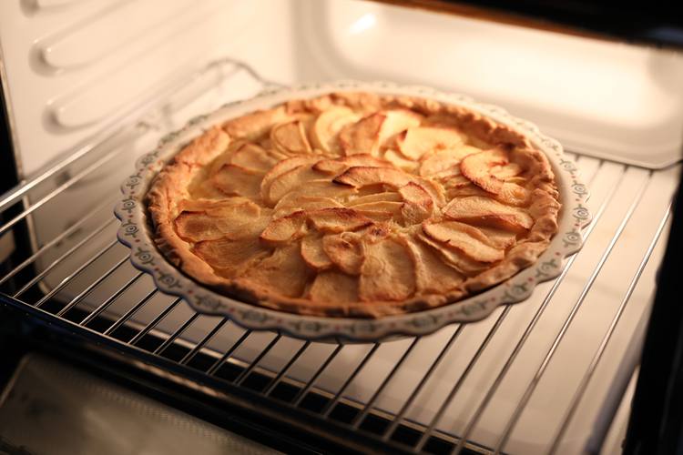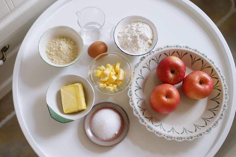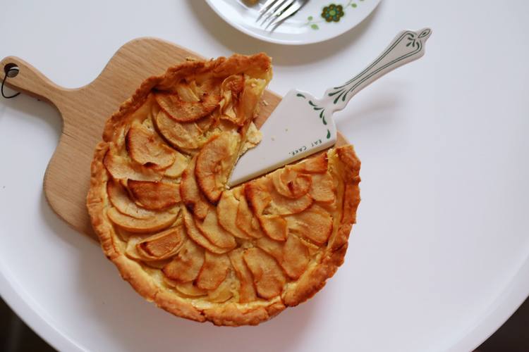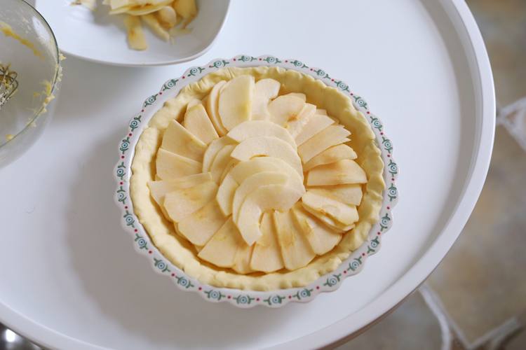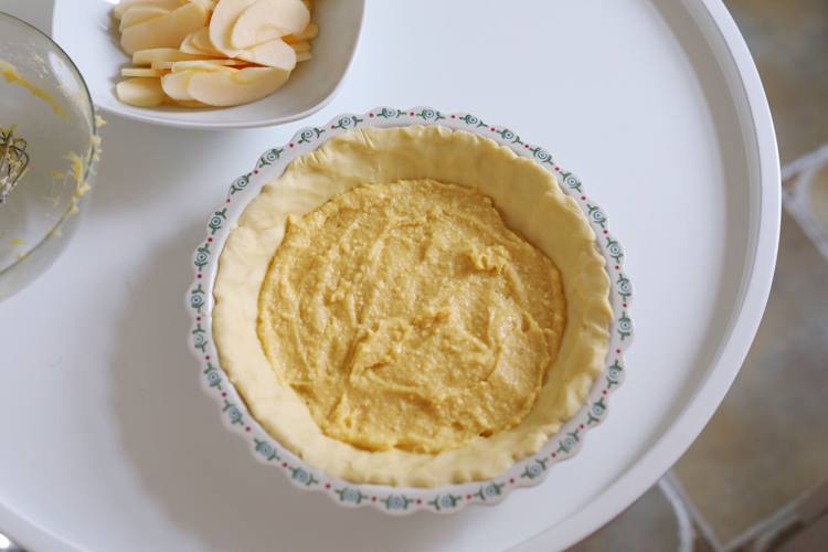 从冰箱拿出派皮,擀薄,放入烤盘,加杏仁奶油馅。
