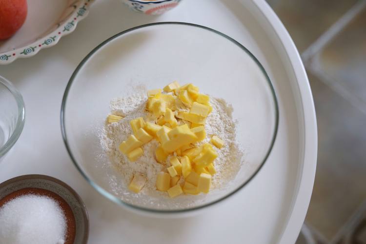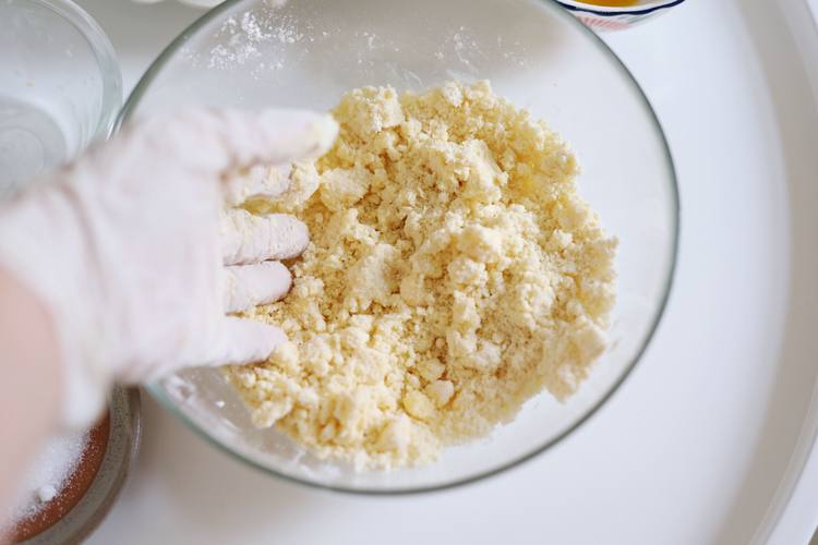 快速混合黄油和低粉成散粉状,用手或者挂刀都可以。然后加入派皮部分的蛋液,盐,水。混合后整形成团包保鲜膜放入冰箱冷藏一小时以上。
