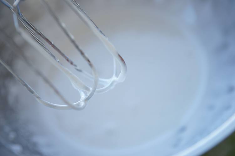 蛋白中加入糖粉打发至没有明显的流动性即可。装一半蛋白糖霜进一个裱花袋。