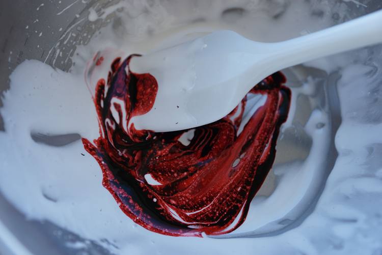 剩下的蛋白糖霜中加入色素,拌匀,装入裱花袋。