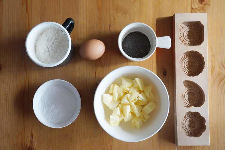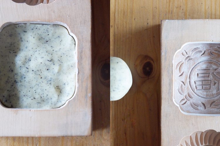 模具中筛入少量面粉,再将多余的面粉磕出来,这样容易脱模,将切好的原片面团揉成团,放入模具中压平,反过来轻轻磕出。
