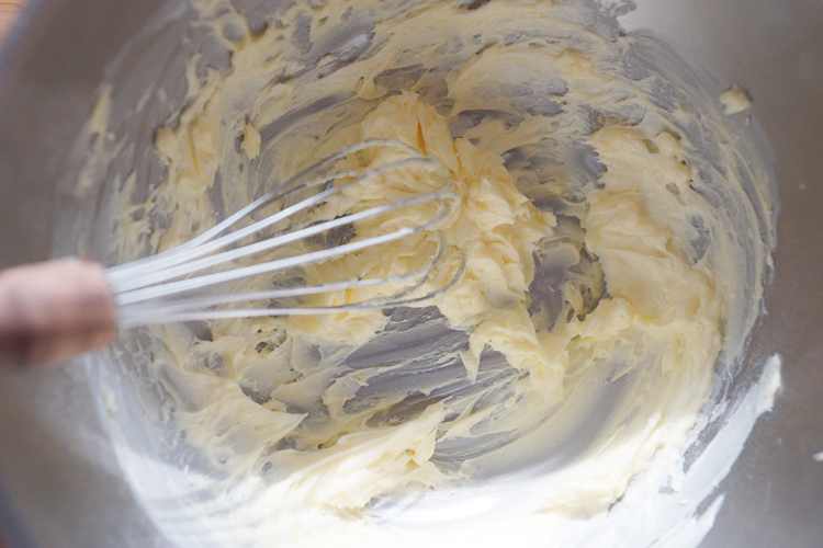 软化的黄油加入糖粉打至顺滑没有颗粒。分两次加入蛋黄,搅拌至融合即可。