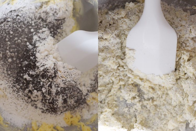 红茶碎要研磨成粉末来使用,低筋面粉和茶粉过筛加入到黄油中,用橡皮刮刀翻拌均匀,开始成粗粗的颗粒状,稍稍按压就可以成团。