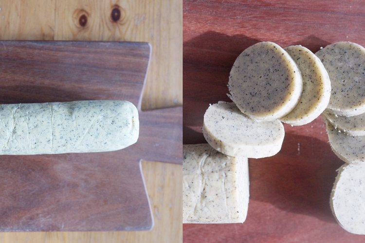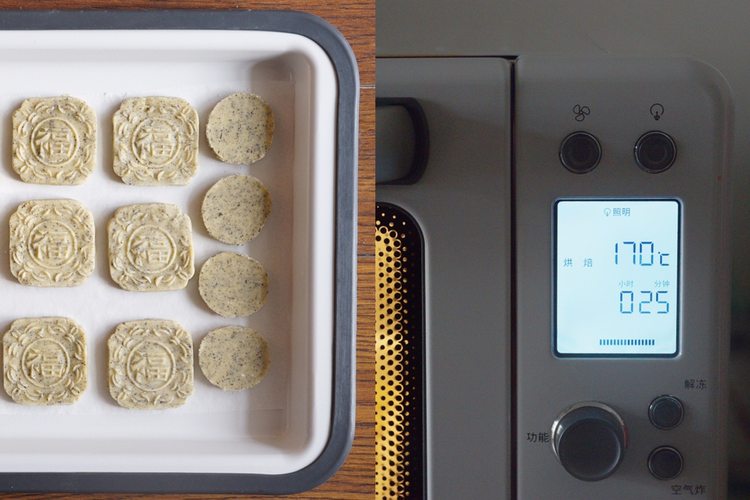 面团用保鲜膜包裹好放入冰箱冷冻1小时取出。切5mm厚的圆片,室温内稍稍解冻软化。同时烤箱预热170度。