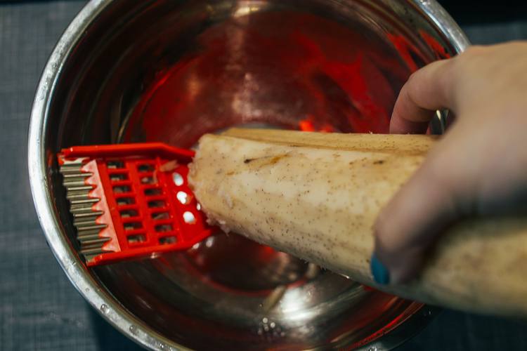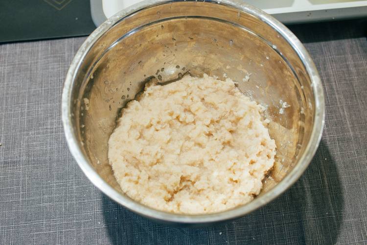 撇出藕泥中的一部分水份,水份的多少决定下一步加面粉的多少,建议不要留太多水份。