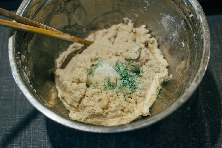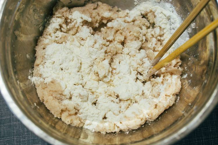 倒入面粉,搅拌均匀,如太稀要适量增加面粉,直至面糊能成团。